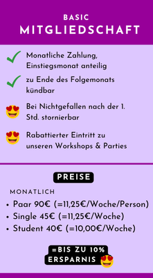 Du kannst zwischen unserem 4-wöchigen Einstiegsangebot für Paare oder Singles wählen - oder Dich direkt für die Mitgliedschaft entscheiden mit dieser am kompletten Anfängerkurs teilnehmen (Dauer: 6-12 Wochen, je nach Gruppe) und anschließend auch in der Stufe A2 weitertanzen.